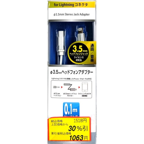 オーム電機 3.5mm ヘッドフォンアダプター 0.1m 変換アダプター for Lightningコネクタ